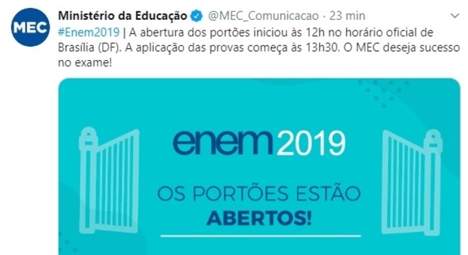 A conta oficial do Ministério da Educação no Twitter errou o horário de abertura dos portões do Enem 2019. Em publicação feita às 11h05 desse domingo (03), o MEC afirmou: "A abertura dos portões iniciou às 12h no horario oficial de Brasília (DF). A aplicação das provas começa às 13h20. O MEC deseja sucesso no exame!"