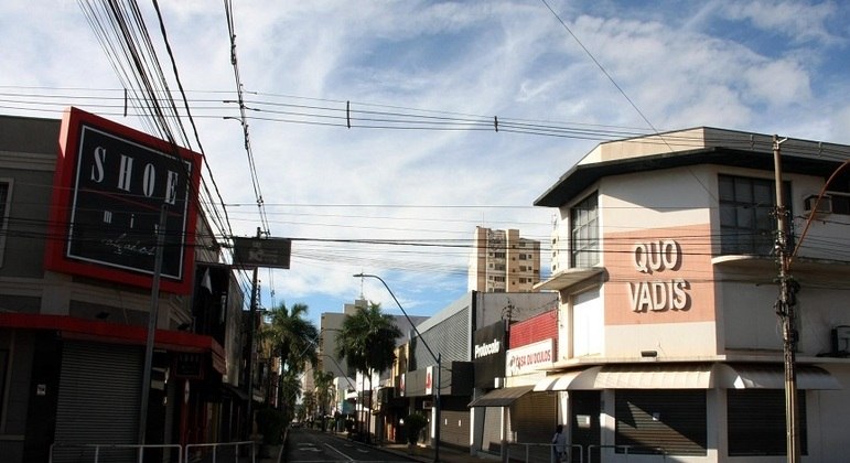 O "lockdown total" deixou as ruas desertas em Araraquara (SP) nesta segunda-feira (22). Bancos estão fechados, supermercados só atendem por delivery e blitze na cidade abordam os poucos carros em circulação para cobrar documento justificando por que as pessoas saíram de casa.